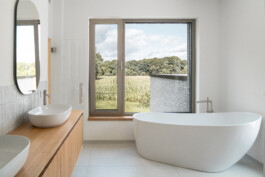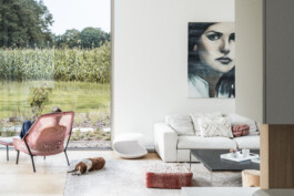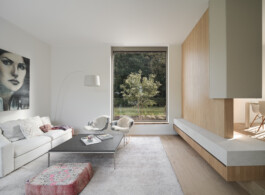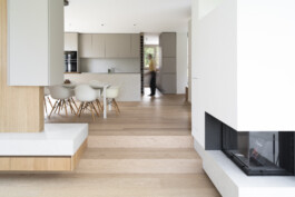 Im Zentrum der Planung standen dabei funktionale und gestalterische Details, die den Alltag komfortabel und ästhetisch bereichern. So wird der Eingangsbereich durch eine eingestellte „Box“ als Abstellraum mit integrierter Treppenanlage strukturiert und klar zoniert. Im Patio-Bereich entsteht durch eine fest eingeplante Sitzbank ein geschützter Aufenthaltsort, der den Wohnraum räumlich und atmosphärisch erweitert und durch die beidseitige Verglasung einen intensiven Bezug zum Außenraum und der Hellen Klinkerfassade der Ziegelei Hebrok herstellt. Die Küche wurde mit einer verdeckten Tür gestaltet, die den Zugang zum Hauswirtschaftsraum ermöglicht. Dadurch wird der private Funktionsraum vom offenen Wohnbereich klar getrennt und ist für Besucher nicht unmittelbar wahrnehmbar. Im geöffneten Zustand kommt hier ein Weinregal zum Vorschein, das den Raum sowohl funktional als auch gestalterisch bereichert. Ergänzt wird das Ensemble durch einen Raumtrenner und einen Kamin, die für eine klare Gliederung und eine wohnliche Atmosphäre sorgen.