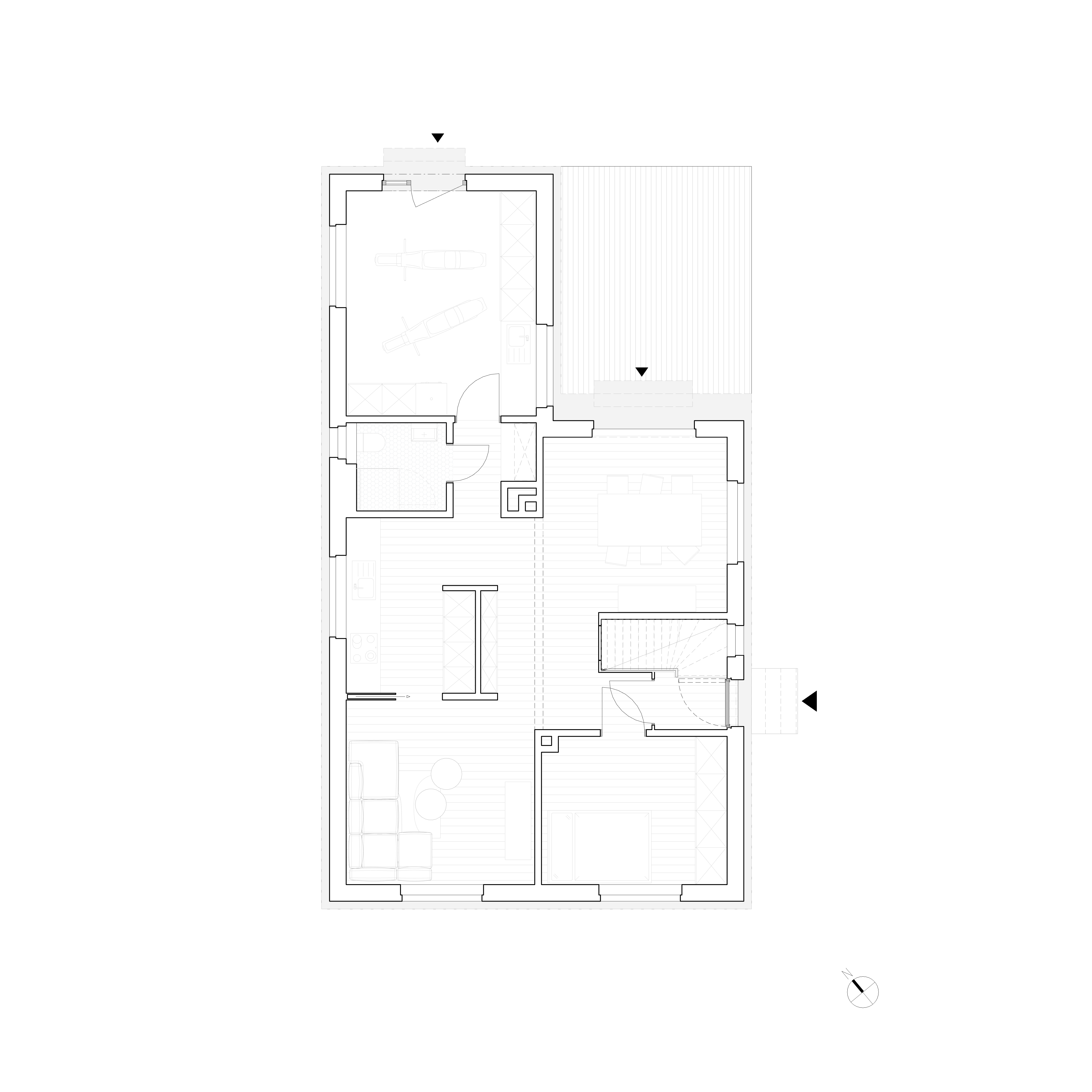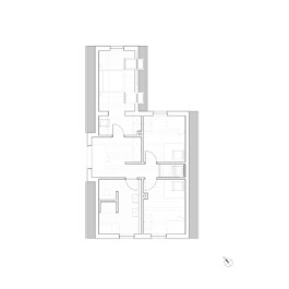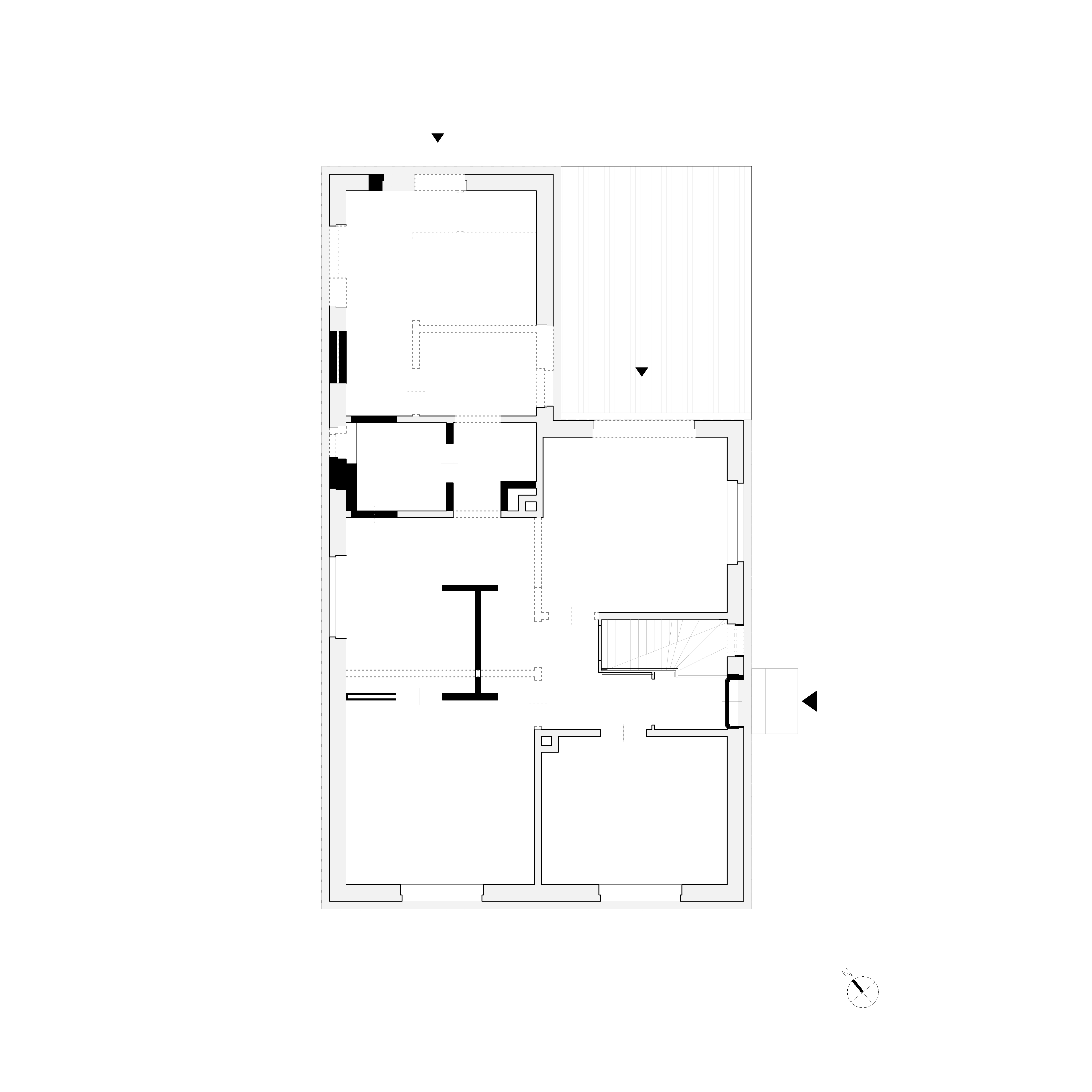 Bei dem Sanierungsobjekt handelt es sich um ein Siedlungshaus im Stadtteil Osternburg aus dem Jahr 1927. Das straßenseitig von Südwesten zu erreichende Haus mit Satteldach ist eingeschossig und weist einen Anbau auf, der als Stall geplant und als Hauswirtschaftsraum verwendet wurde. Um die bisherige Wohnfläche von 126 m² zu erweitern, wird der Spitzboden des Stalls ausgebaut und dient als Schlafbereich. Außerdem werden vorrangig im Erdgeschoss strukturelle Veränderungen vorgenommen, um einen zonierten und trotzdem fließenden Grundriss zu erzeugen.