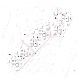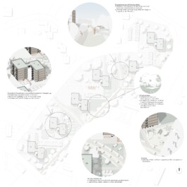 Ausgehend von der Sanierung eines einzelnen Mehrfamilienhauses wurde ein übertragbares Konzept für die zukunftsfähige Weiterentwicklung des gesamten Wohnquartiers entwickelt. Wiederkehrende bauliche Strukturen und energetische Defizite bildeten dabei die Grundlage für eine serielle Strategie, die bestehende Substanz erhält, vorhandene Strukturen aktiviert und gemeinschaftliche Qualitäten stärkt. Vorgesehen ist eine Aufstockung der Bestandsgebäude um ein fünftes Vollgeschoss mit klarer Flachdachgeometrie und zusätzlichen Wohneinheiten, deren Typologie sich am Bestand orientiert. Vorfabrizierte Holzfassadenelemente, verglaste Laubengänge und außenliegende Aufzüge ermöglichen eine wirtschaftliche Umsetzung bei gleichzeitig hoher gestalterischer Qualität. Darüber hinaus wird die technische Gebäudeausrüstung vollständig erneuert und die energetische Hülle umfassend modernisiert. Ergänzt wird das Konzept durch die barrierefreie Erschließung sowie gemeinschaftlich nutzbare Freiräume im Außenraum.